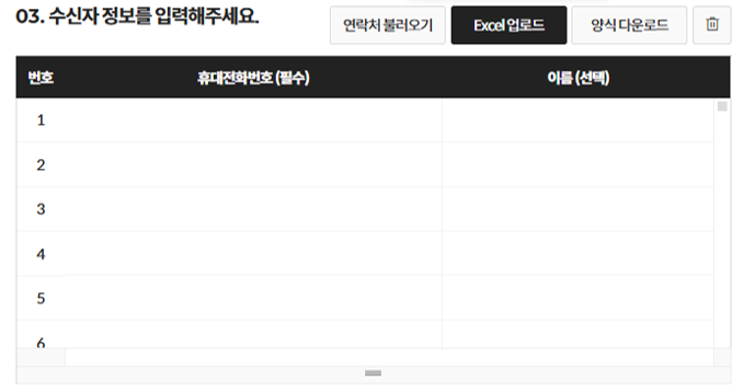 엑셀 업로드 시 수신자 핸드폰번호 필드에 공백이 있어도 자동으로 삭제 처리됩니다. 불필요한 수정 없이 더 안정적으로 발송할 수 있어요.