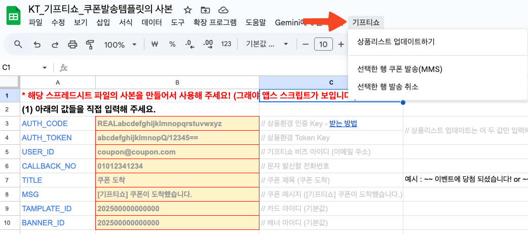 📌 받으신 상용환경 인증 KEY와 토큰 KEY 값을 입력해주세요 📌 아이디와 보내실 번호를 입력해주세요 📌 텍스트를 커스텀해주세요 - 소비자에 맞춰 보낼 수 있습니다. 📌 상단바에서 '기프티쇼' 를 누르면 자동발송 및 상품 코드를 최신화 할 수 있어요