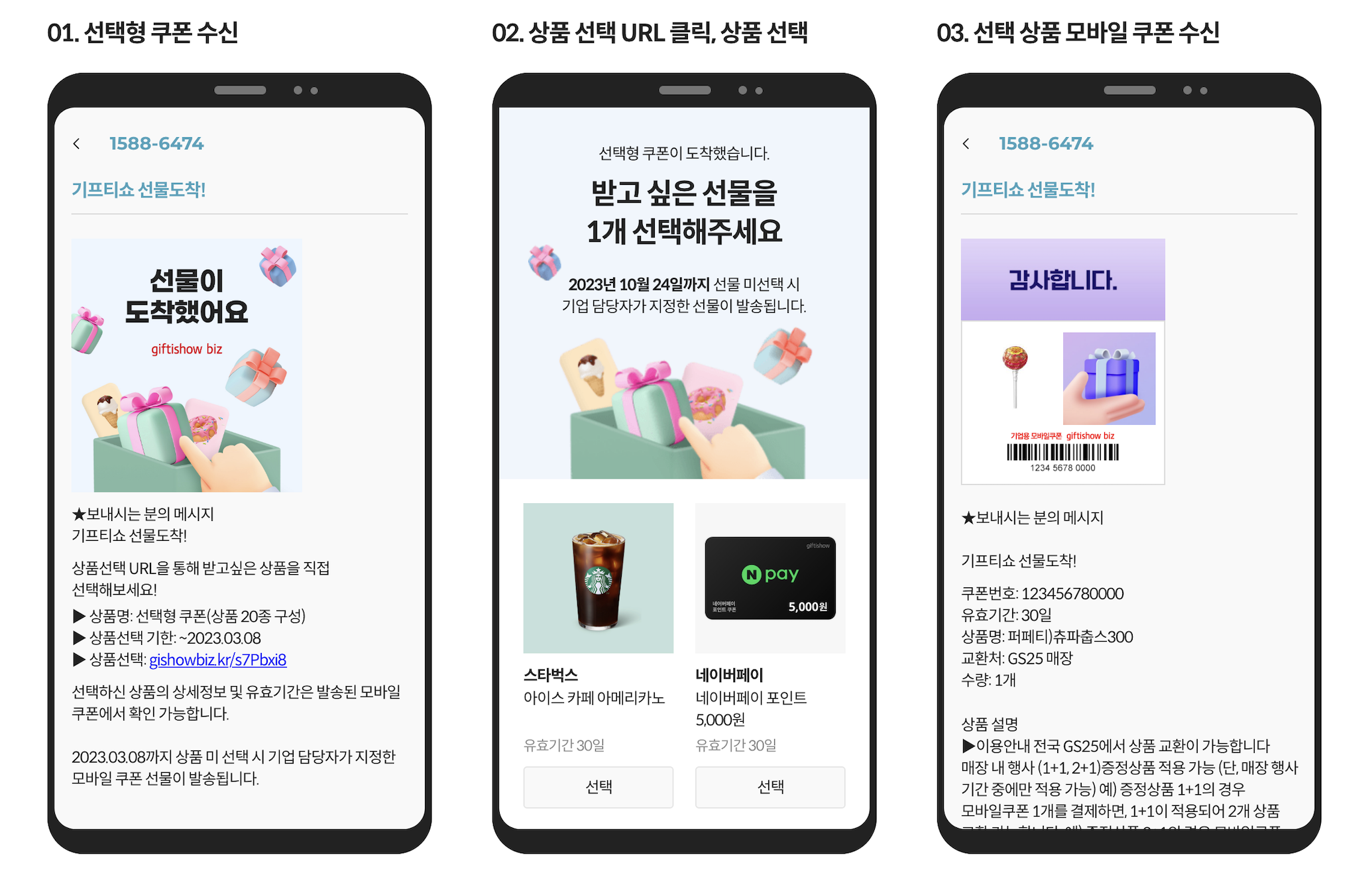 맞춤형 선물 발송 : 임직원이 고른 선물이 즉시 모바일 쿠폰으로 발송됩니다.