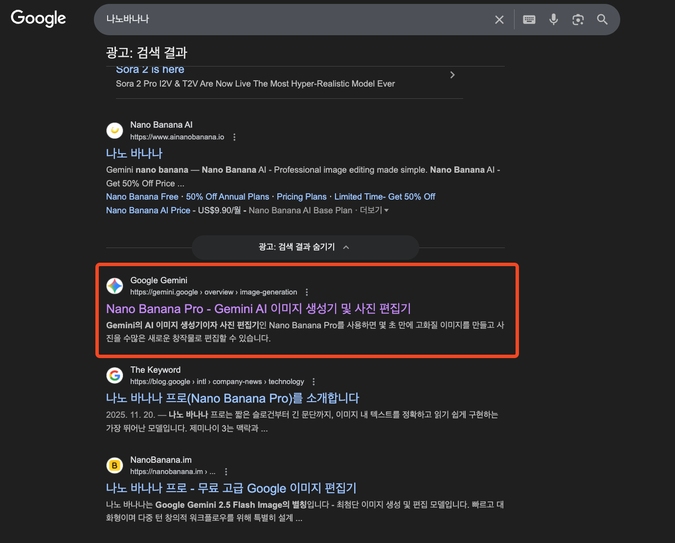 그래서 아래 페이지 중 헷갈리지 마시고 '구글 재미나이-나노바나나' 를 선택하셔서 들어가셔야 합니다. 다른 서드파티 서비스들이 '나노바나나' 라는 이름으로 서비스를 내고 있으니 주의하세요! |
