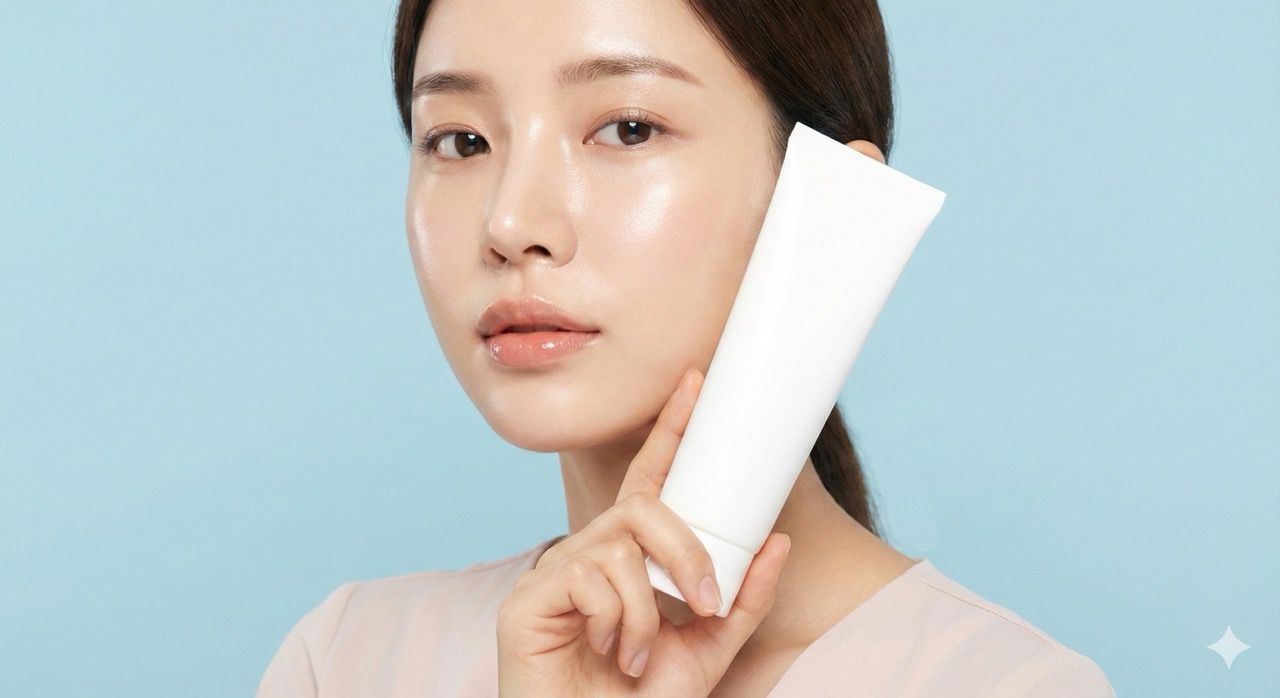 프롬프트 : Korean K- POP style beauty model holding a white skincare tube beside her face against a pastel blue background. Radiant dewy skin, glossy natural lips, clean studio lighting with refined highlights, professional cosmetic advertising composition, photorealistic and crisp detail. ultra-detailed and photorealistic. |
