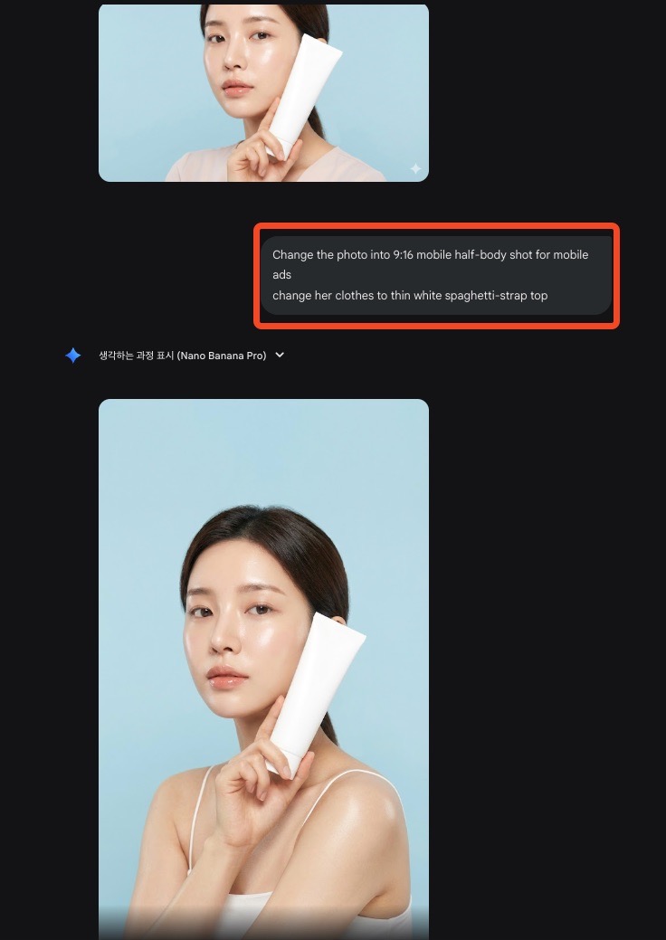 나노바나나의 가장 큰 장점은 프롬프트 한두 문장만 바꿔도 모델·포즈·구도·제품까지 전부 자연스럽게 변경된다는 점입니다.