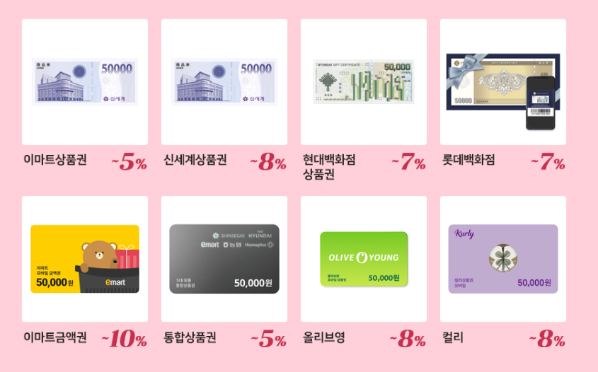 💡이마트 금액권(10%), 신세계·현대·롯데 백화점(7-8%), 올리브영·컬리 8%, 통합 유통·이마트 상품권(5%) |