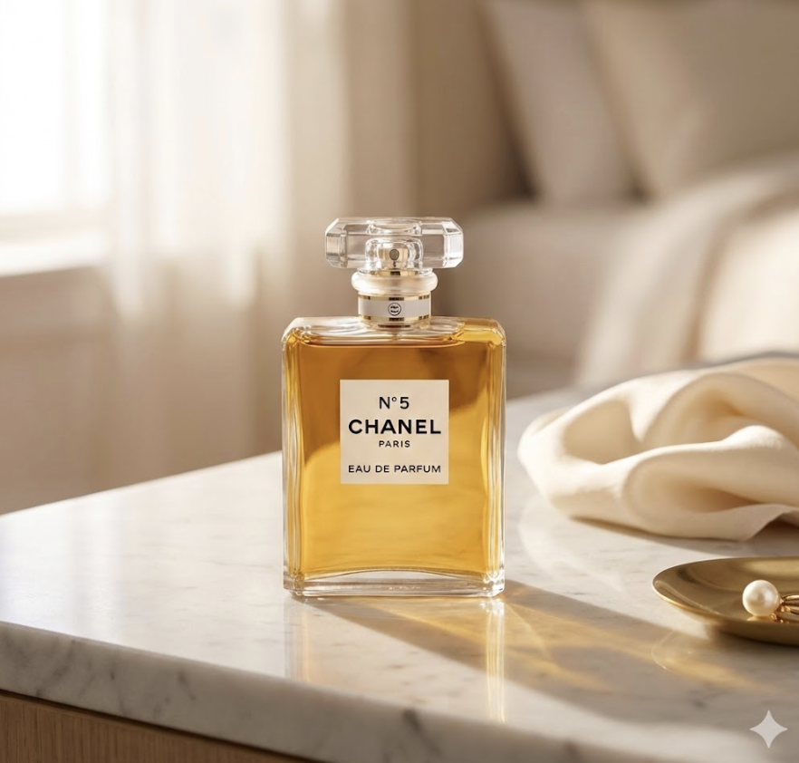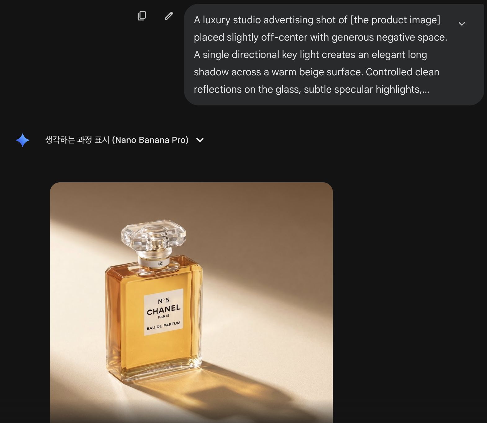 예시 제품은 오늘 첨부한 샤넬 No.5 향수로 진행합니다. (핵심: 제품 사진을 업로드해두고, 아래 프롬프트로 ‘촬영한 듯’ 다양한 컷을 뽑는 방식이에요.)