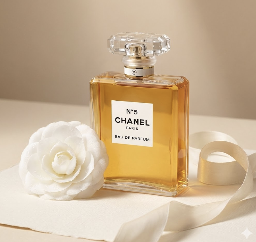 Prompt (EN) A high-end still-life advertising composition featuring [the product image] styled with minimal, tasteful props that suggest luxury (e.g., a single white camellia flower, a soft ribbon, or a textured paper backdrop). The set is elegant and uncluttered. Cinematic soft light with subtle gradients in the background. The product label is fully visible and razor-sharp. Photorealistic editorial fragrance advertising. |